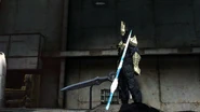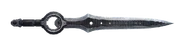 At first, the blade widens until it surmounts in width approximately ten inches from the hilt. At that point, it slowly becomes narrower until the tip of the blade is reached. There are three holes of various size in one section, and three more of a much smaller size closer to the end. There were some design changes from IB1 to IB2; the color of the side of the Blade is different and appears to be laced with circuitry, and has a gold-like section in the middle, possibly referencing the blade being fully-activated.. The Blade has a blue hit arc even though it is one of the non-elemental swords (which usually have a red-orange hit arc).