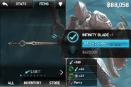 The Infinity Blade, or commonly referred to as The Modern Infinity Blade is the signature weapon of The Worker of Secrets, and a Light Weapon usable by Siris. The weapon starts at level 5, has 600 attack, a bonus combo, (see bellow) is available in the store for {{gp|600,000}, and takes 40,000 XP to master. The only noteworthy things about this weapon is that it is a necessary to unlock The Classic Infinity Blade, and has a easy to trigger bonus combo.